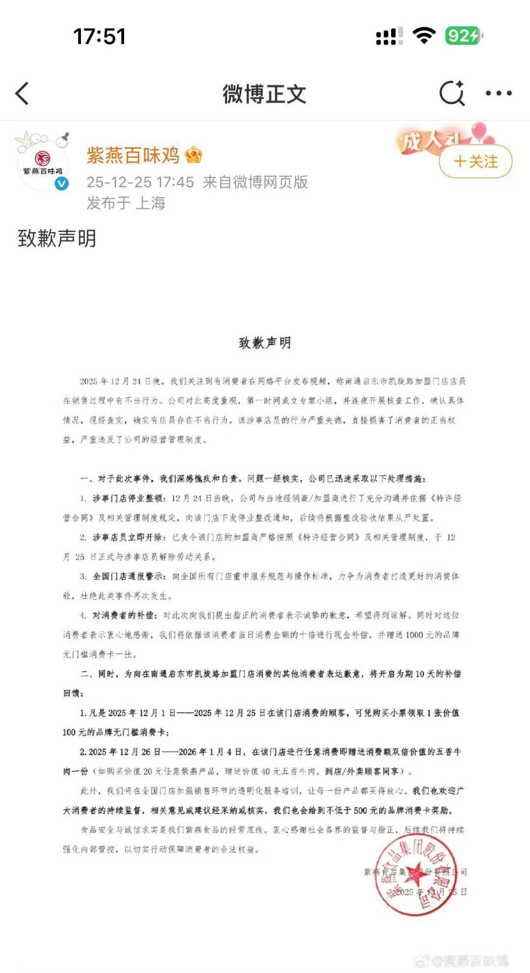 同时,紫燕百味鸡表示,为向在南通凯旋路加盟门店消费的其他消费者表达歉意,将开启为期10天的补偿回馈。凡是2025年12月1日-12月25日在该门店消费的顾客,可凭购买小票领取1张价值100元的品牌无门槛消费卡;2025年12月26日-2026年1月4日,在该门店进行任意消费即赠送消费额双倍价值的五香牛。